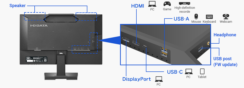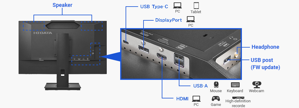 It also features two-port USB hub, enabling you to connect peripherals such as mouce, keyboards and webcams to this product instead of your laptop. With this monitor, you can take it with you not only for meetings but also for business trips and outings—just unplug one cable and you're ready to go.In addition, it is also equipped with HDMI and DisplayPort, helping you connect to many different devices.