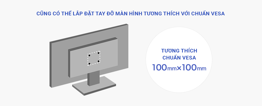 Có thể lắp đặt với tay đỡ hoặc chân đế màn hình theo chuẩn VESA kích thước 100mm × 100mm!