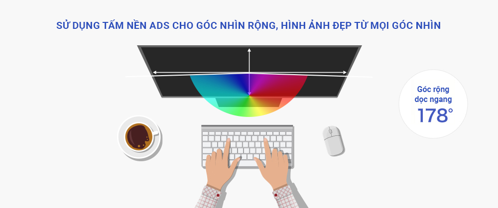 Sử dụng tấm nền ADS (Advanced super Dimension Switch) cho góc nhìn rộng 178° theo cả chiều ngang và dọc. Nhờ đó, màu sắc và độ tương phản ít bị thay đổi theo vị trí hoặc góc nhìn, giúp hình ảnh hiển thị rõ nét từ mọi góc độ.
