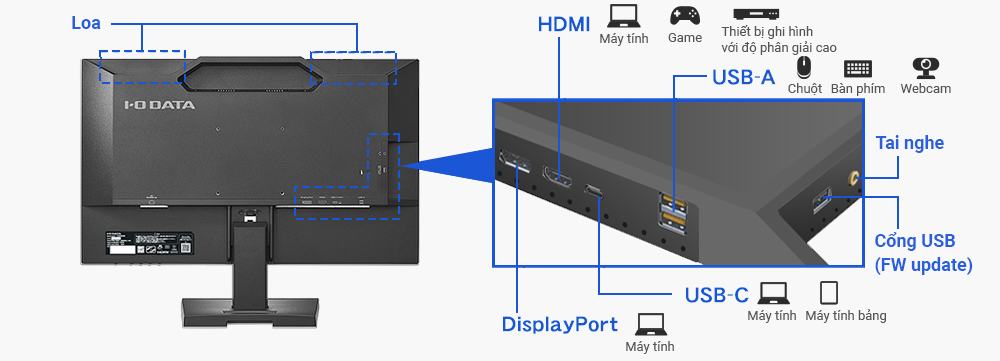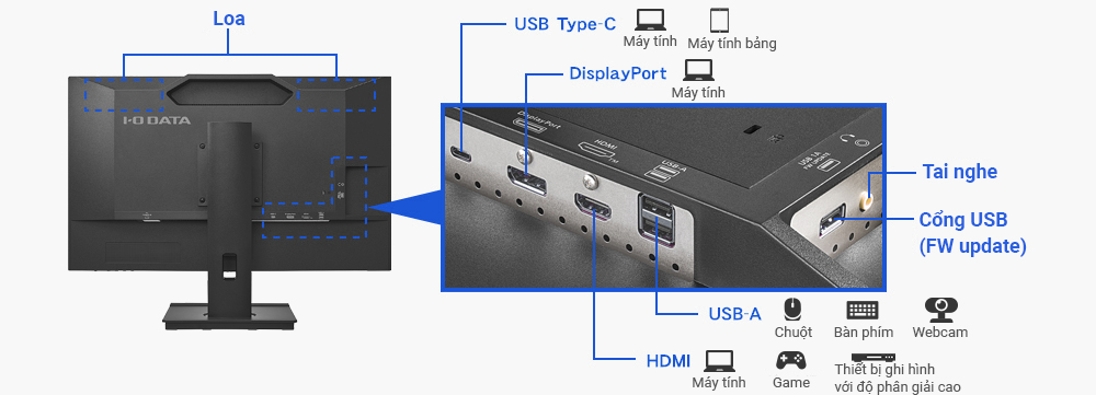 Sản phẩm có trang bị đầy đủ các cổng kết nối tiện lợi như USB Type-C, DisplayPort và HDMI, giúp kết nối dễ dàng với máy tính và thiết bị AV. Ngoài ra, với USB HUB tích hợp (2 cổng USB-A), bạn có thể kết nối dễ dàng các thiết bị như chuột, bàn phím hoặc webcam.